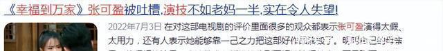 这之后,张可盈的资源开始好了起来,尤其是搭档赵丽颖出演了《幸福到万家》后,因为何幸运这个角色,演技也引发了探讨,当时呈现两极分化的评价: 一方面有人认为她的哭戏很有共情力,表演细腻富有层次感; 但更多的声音则是“用力过猛、只会瞪眼抿嘴”,还有人直指她的演技“不如母亲一半”。